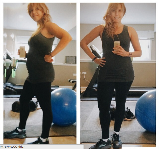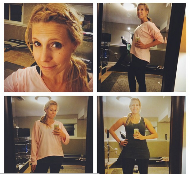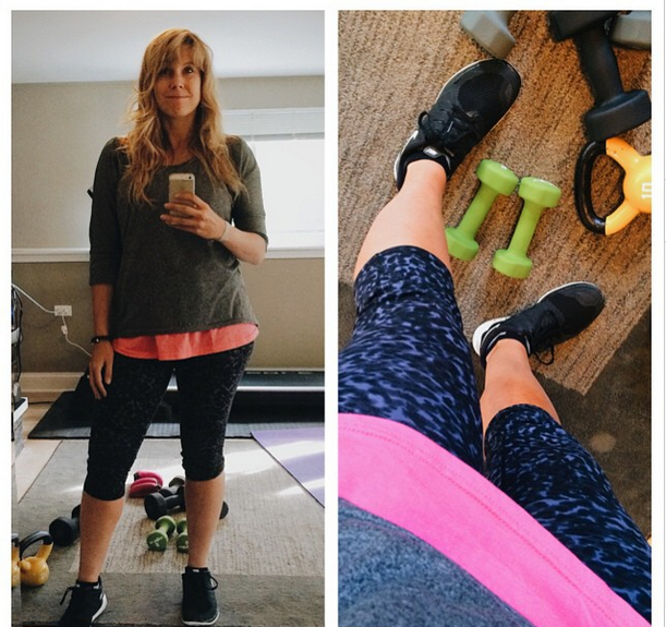 As far as workout wear goes: 1st trimester I just bought larger sizes of pants I liked. My Athleta Chaturanga leggings were king. They’re really soft and stretchy, not a compression pant. I also rocked a pair of seamless champion tights that I just bought huge. I didn’t feel comfortable bouncing a ton, so it didn’t matter if they weren’t tight enough to really stay up.