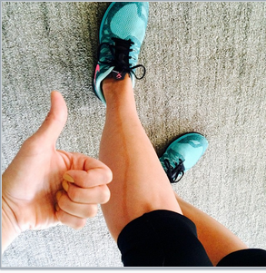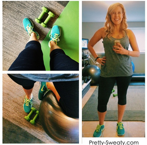 I’m pretty into my purple and black tie-dye LuluLemon Wonder Under fold-over leggings. Fold-over really just means I always wear them unfolded/up over my poppin’ fresh dough. And of course, always, Nike Frees. The black tongue and laces really make this pair. I love them to bits.