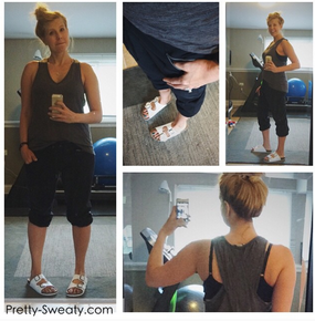 So this was basically my all day post-baby uniform for the summer. Joggers and some kind of a baggy but with big arm holes so you see my bra type of shirt. The top and bottom are both Athleta. The top is sold out now (summer item) but the bottoms are the Metro Slouch capris and you can get them in full length for fall. I recommend them. Comfy. Not tight but not sloppy. If you have an ass, that is.