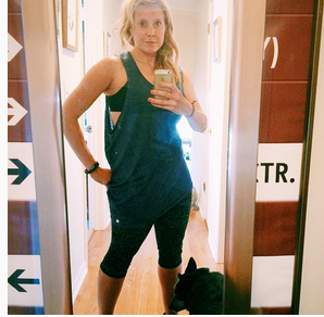 Same Fabletics top. Different color. My wardrobe choices (read: what fits) right now are very 90s/ bold colors and black/ WWF/ Punky Brewster…purples, teals, black and bleachy tie-dye…not sure what’s going on. I actually wore the same type of clothes in 8th grade: tunic, sports bra top, leggings. Weirrrrrrrrd.